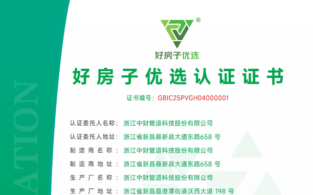 中财管道作为国内管道行业首家获国标建信颁发的“好房子优选”认证证书
